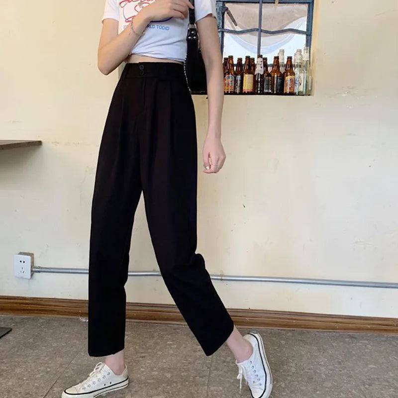 Fashion Loose Streetwear Pants by Lucyever blend casual comfort with elegant Korean-inspired style, perfect for various occasions from office to everyday wear. Crafted from a polyester blended fabric with medium stretch, these ankle-length pants offer a loose fit and a high waist for flattering shape and comfort. The button fly closure ensures secure wear, while the deep gray and black color options provide versatile wardrobe staples. Available in sizes S to XXXL, each length ranges from 64 cm to 84 cm, accommodating diverse body types. Ideal for spring, summer, and autumn, these pants combine practicality and modern fashion effortlessly.
