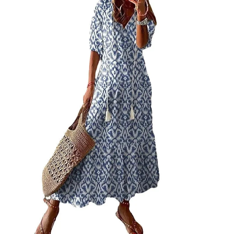The Flower Print Bohemian Dress is designed for juniors seeking effortless style across seasons. Crafted from high-quality polyester synthetic fiber, this ankle-length dress features a loose A-line silhouette with a flattering V-neck and petal short sleeves that add a breezy, bohemian touch. Its non-stretch fabric and pullover closure ensure comfortable wear, while the vibrant printed design enhances its casual yet elegant appeal. Suitable for summer through winter, it suits a variety of occasions and body types with its relaxed waistline and versatile fit. Ideal for wholesale or dropshipping, this dress blends fashion with ease for women who appreciate both comfort and style.